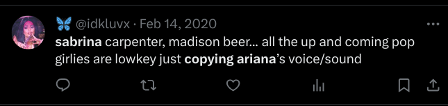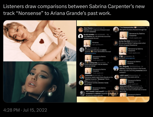 Whether its about her number one single, Nonsense, sounding like it came out of Ariana’s discography according to fans, or even some side eyeing the fact that Sabrina put out a perfume last year (even though she and Ariana are not the first nor last pop stars to do that), or even comparing some other songs from Sabrina to Ariana, the trend to do so seems to be there. And while now it might be favorable, eventually this is a trend that can turn very toxic.