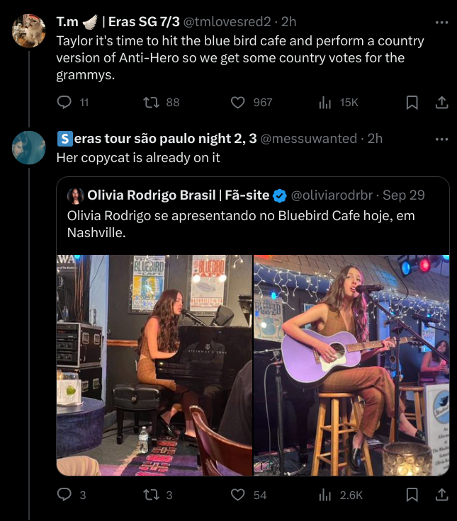 And then Olivia gave credit to Taylor over the bridge to déjà vu because of it being inspired by Taylor yelling on the bridge of her single Cruel Summer, much like Olivia did on deju vu (even though Taylor does not own the concept of yelling on the bridge of a song), and things started to fall apart. Adding on to that, the fact that Olivia made no mentions last year of listening to Taylor’s 10th studio album Midnights, nor attending her Era’s tour, which has sparked rumors of a feud between the two.